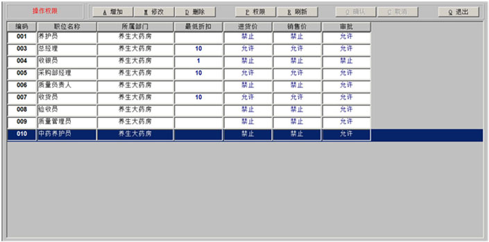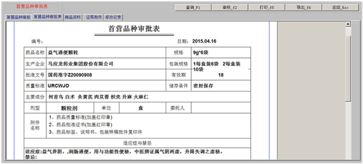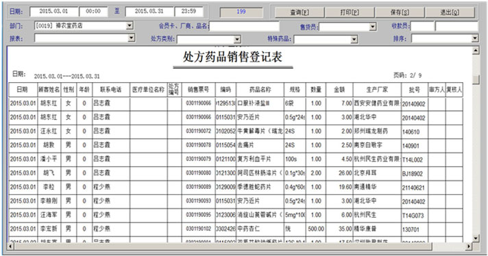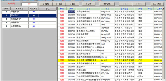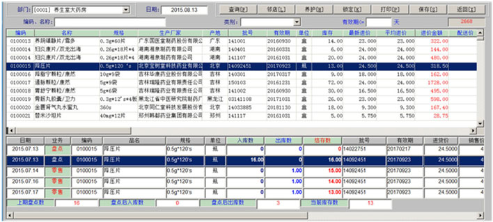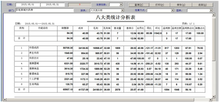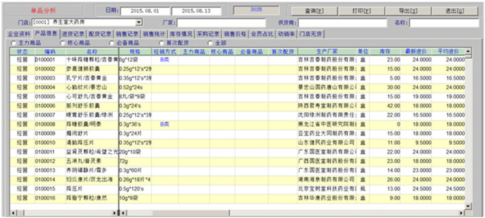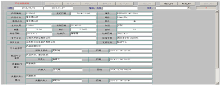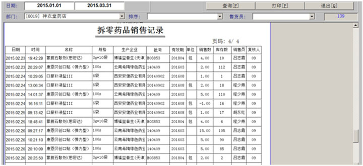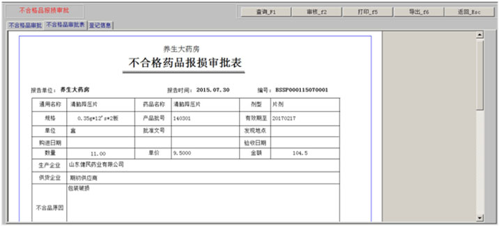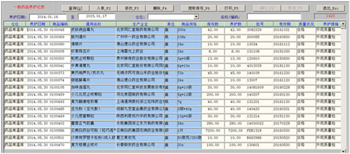 一、药品拆零 1、药品拆零审核 2、拆零单据查询 3、药品拆零记录 4、拆零品种一览表 二、药品报损 1、报损审核单 2、报损单据查询 3、药品报损记录 4、不合格品报损审批表 5、不合格品报告 6、不合格品台账 7、不合格品销毁 三、药品养护 1、设备一览表 2、设备使用记录 3、药品养护记录表 4、中药饮片养护记录表 5、陈列药品质量检查记录 6、药品养护档案表 7、近效期药品催销表 四、温湿度记录 1、库房温度记录表 2、营业场所温度记录表 3、室外温度记录表 五、盘点管理 1、帐面盘点 2、实物盘点 3、查询盘点盈亏分析表 4、查询盘点盈亏明细表 5、查询盘点统计分析表 |